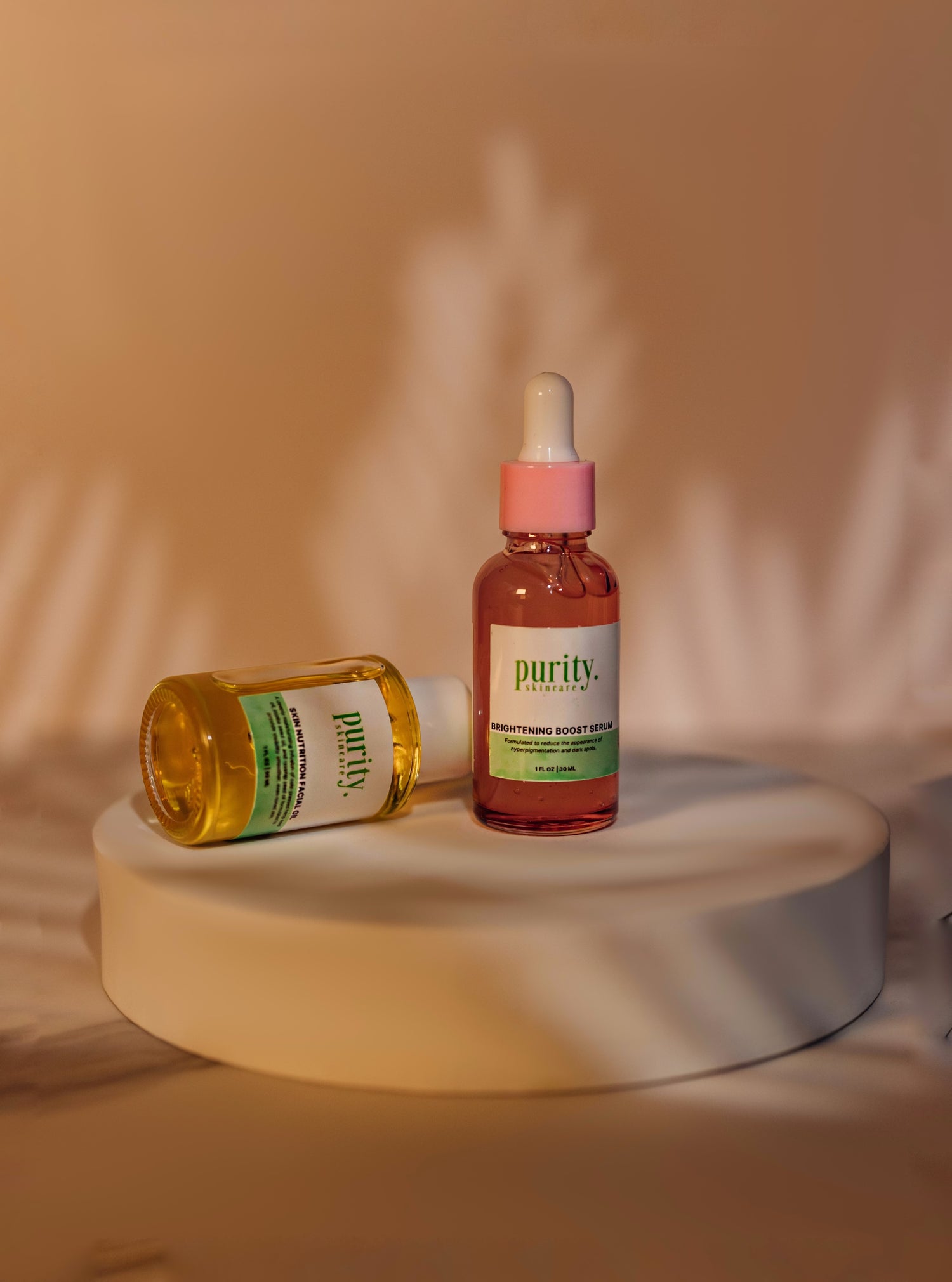 Our Brightening Boost Serum, Turmeric and Lemon Hydrogel Mask, and Body Wash are handcrafted to brighten dark spots and hyperpigmentation.